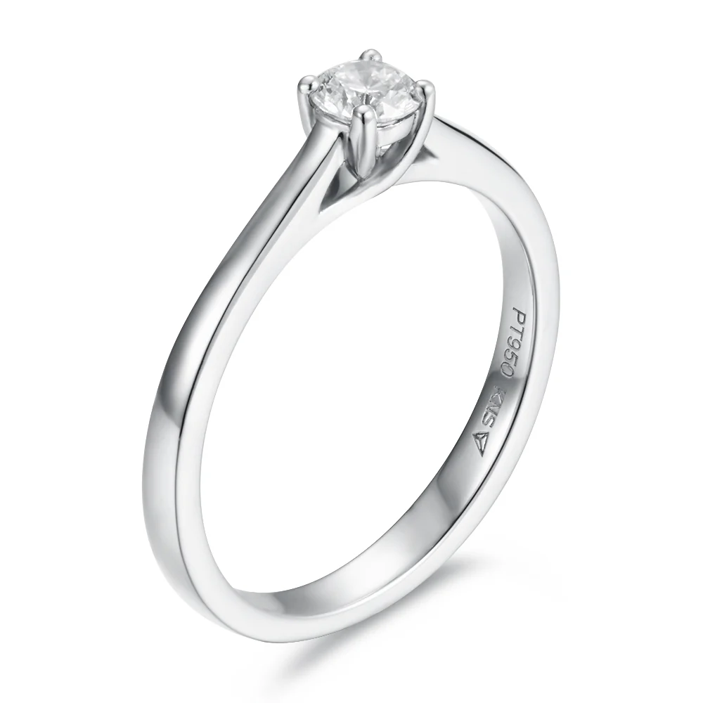El anillo de compromiso solitario Edge destaca por su diseño equilibrado y atemporal. Su banda delicada se extiende suavemente hacia la piedra central, sosteniéndola con un engaste clásico de cuatro garras que permite maximizar el ingreso de luz y realzar el brillo natural del diamante.