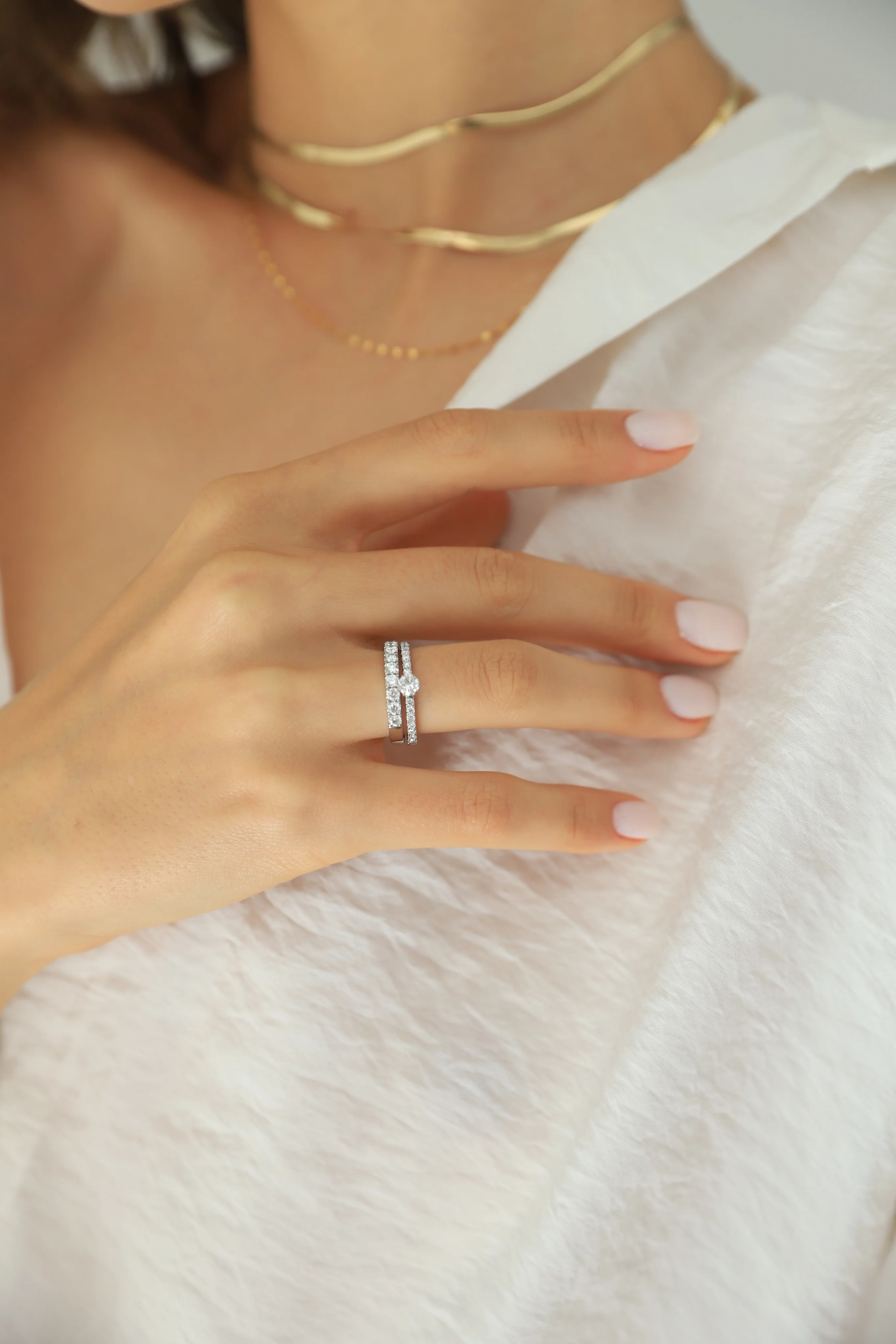 Este clásico y lujoso anillo de compromiso tiene brillantes pavé de diamantes fa la mitad del anillo. En total este diseño posee 16 brillantes sumando 0.30 ct