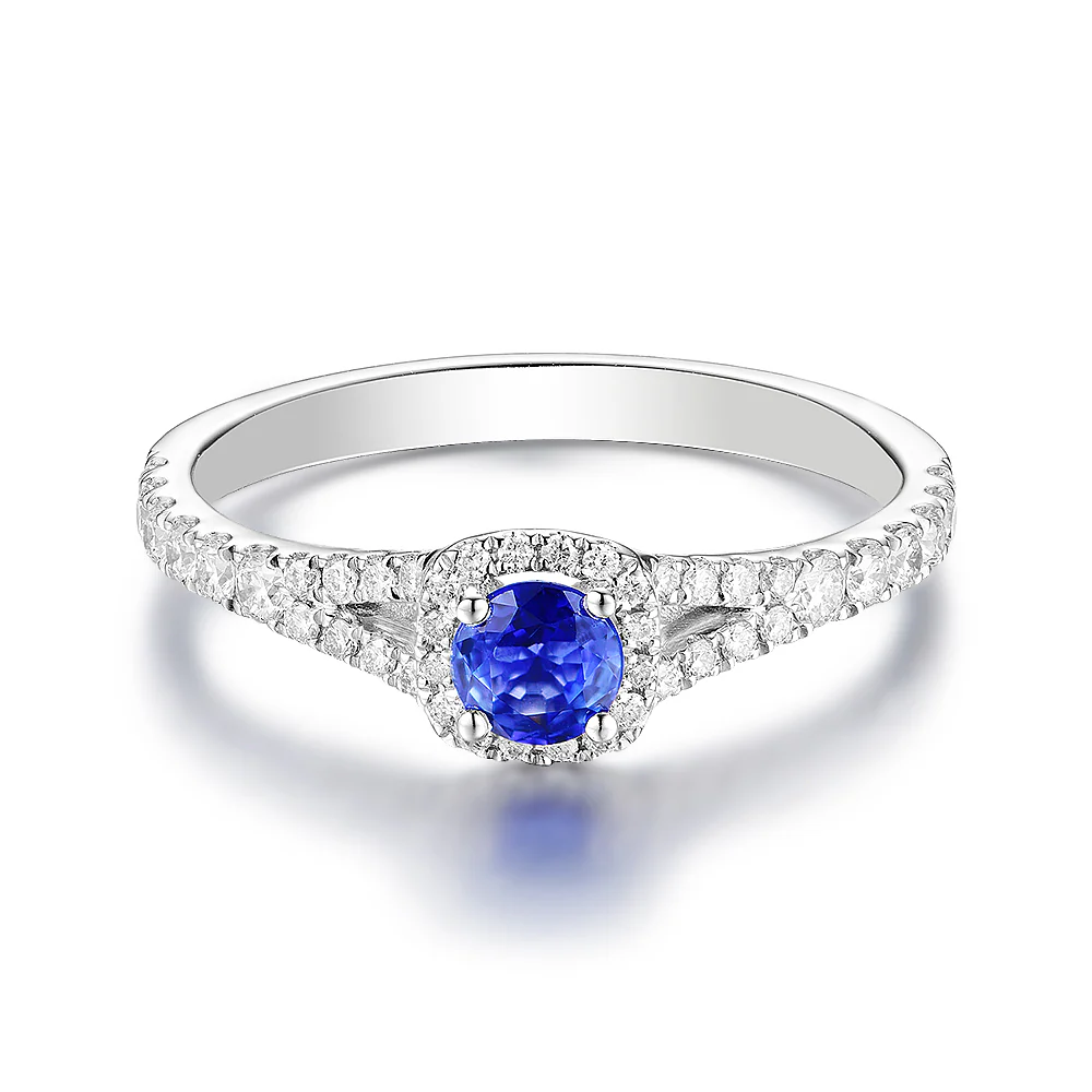 Un deslumbrante Halo de diamantes complementando al Zafiro Azul. Un cuerpo donde se divide en dos cintillos de diamantes. Este diseño se realiza con 42 brillantes con un quilataje total de 0.36 ct.