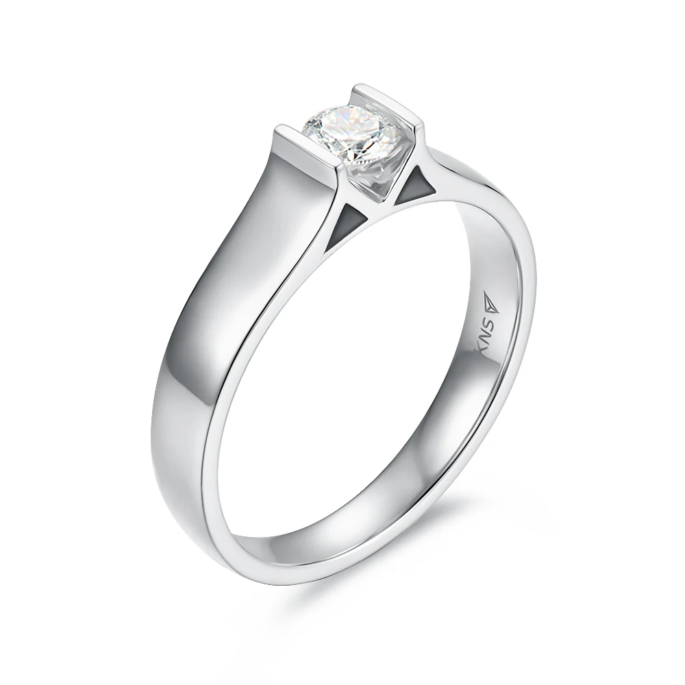 El anillo de compromiso solitario Malta se distingue por su impactante engaste en tensión, una propuesta moderna y sofisticada que sostiene el diamante central mediante la precisión y fuerza del diseño. Esta técnica crea la sensación de que la piedra flota entre los extremos del aro, potenciando al máximo su brillo y presencia.