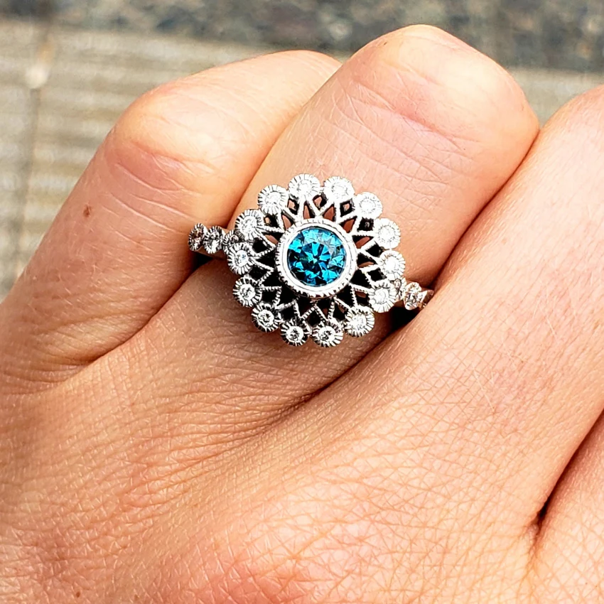 Este anillo verdaderamente excepcional de inspiración vintage presenta un extraordinario diamante azul de 0.52 CT con bisel rodeada de celosías profusamente detalladas y un halo de diamantes brillantes (1/10 de peso total en quilates).